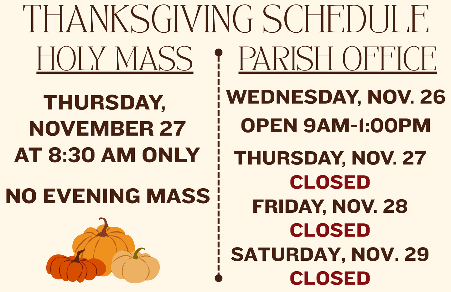 - Daily Masses at 8:30 am Monday - Saturday in English